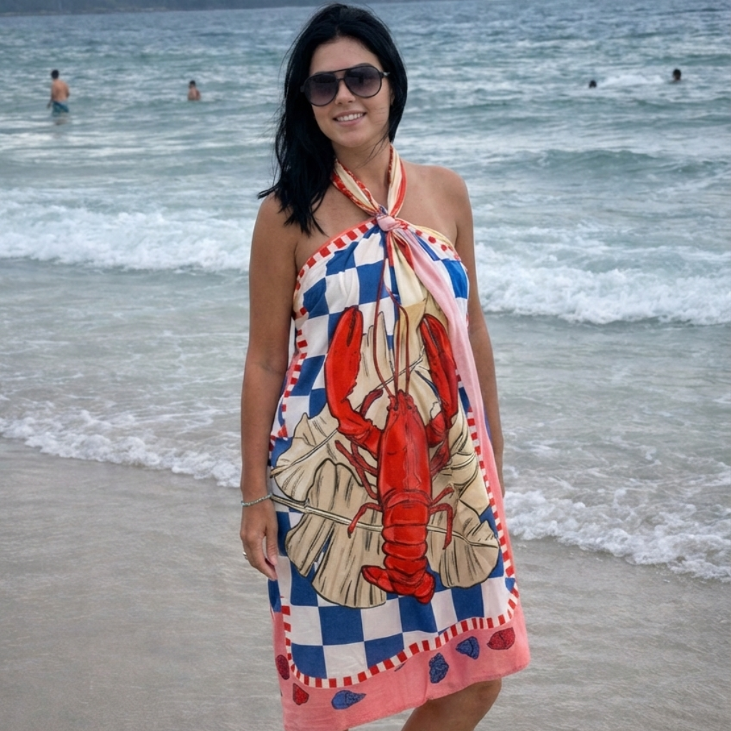 Vestido pareo Langosta + tote bag náutica con bolsillos internos. Elegante, audaz y listo para verano. Descuento por transferencia disponible.